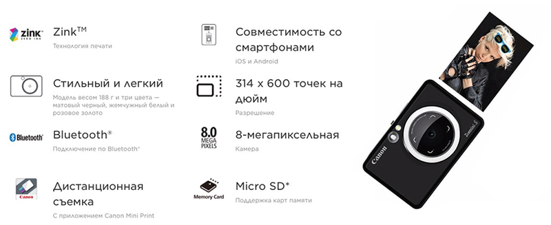 Создавайте и печатайте фотографии на одном многофункциональном устройстве «2 в 1». 8-мегапиксельная камера, слот для карты Micro SD* и технология ZINK™ делают Canon Zoemini S идеальным решением для фотосъемки на ходу.