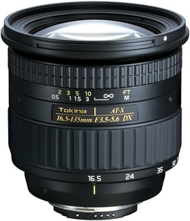Объектив Tokina AT-X 16.5-135 mm DX F3.5-5.6 подходит для цифровых зеркальных камер с размером матрицы APS-C. Имеет минимальное фокусное расстояние 16,5 миллиметров, что на камере Canon с кроп-фактором 1.6x позволит получить эквивалент 26,4 миллиметров, а на камерах Nikon с кроп-фактором 1.5x порядка 24,75 миллиметров в эквиваленте для полных матриц 35 мм. Это обеспечивает более широкий угол обзора, чем у стандартных штатных объективов, нижний порог фокусных расстояний которых начинается обычно с 18 мм. Верхний порог фокусных расстояний 135 мм при пересчете для неполных матриц дает 200 мм.