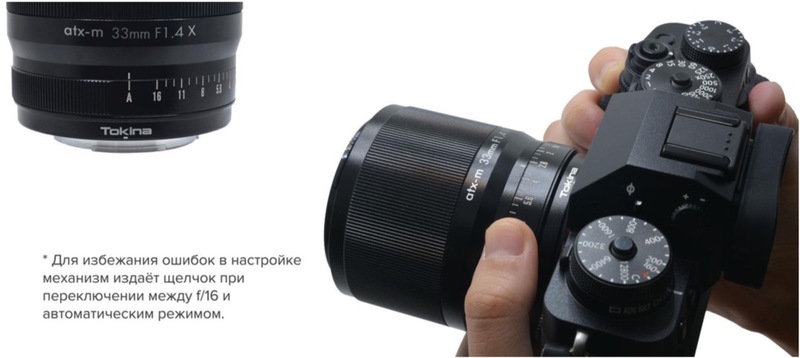 Объектив полностью совместим с 5-осевой матричной стабилизацией, реализованной в камере. Философия дизайна Fujifilm X заключается в том, чтобы использовать диски управления на камерах для имитации традиционной съёмки на плёночные фотоаппараты. Tokina atx-m 33mm F1.4 X снабжен кольцом диафрагмы, переключающим положения без щелчков и позволяющим фотографам вручную плавно управлять диафрагмой от f/1.4 до f/16 в режиме видео, а также автоматически (положение A) с помощью настроек камеры при фотосъёмке.
