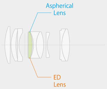 Объектив состоит из 9 элементов в 7 группах, включая одну асферическую линзу из сверхнизкодисперсионного стекла ED, предотвращающую сферическую и хроматическую аберрацию. Это обеспечивает выдающиеся результаты и сводит к минимуму вариации качества на различных дистанциях до объекта съемки.