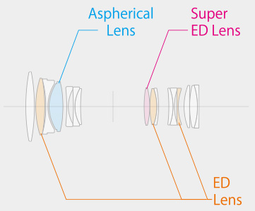 Оптическая конструкция состоит из 16 элементов в 12 группах, включая одну асферическую линзу, одну линзу из стекла Super ED и три — из стекла ED. Хроматические аберрации подавляются благодаря хорошо сбалансированному расположению линз из стекла ЕD, а сферические аберрации — благодаря асферической линзе, обеспечивающей высокую разрешающую способность.
