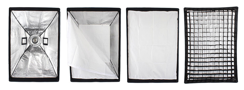 Закрытая конструкция исключает паразитные блики и потери светового потока. Отражающая серебристая поверхность обеспечивает равномерное распределение света внутри софтбокса, белые полупрозрачные рассеиватели делают свет более мягким.